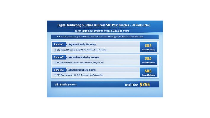 Digital Marketing & Online Business SEO Post Bundles – 78 Ready-to-Publish Posts Stop wasting hours writing content that bar...